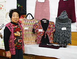 区の文化祭に手編みのセーターやカーディガン、ショール、帽子などを出品しました。今年編んだ作品は、まだ他にもたくさんあるんですよ。かぎ針編みも棒針編みもどちらも編みます。毎日編んでいますが、好きなことなので肩はこりませんね。 |
