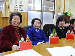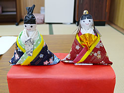 上田光子さん(中代区)は「着物の衿の合わせやお内裏様の烏帽子をかぶせるところが難しかったけどかわいくできました。家の中で一番見えるテレビの横に飾ります」と話されました。 |