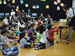 はじめに人形劇ひまわりのブラックパネルシアターや人形劇が行われ、子どもたちは舞台の人形に声をかけたり、手を振ったり大喜び。保育士の本田先生の読み聞かせでは、真剣な眼差しで絵本に見入っていました。くまモン体操で元気に体を動かしたあとは、牛乳パックを利用した小物入れ作り。色紙やシールで可愛らしくデコレーションし、子どもたちは満足顔でした。
