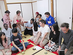 お茶会は、千利休の作法を受け継ぐ肥後古流の皆さんにお道具からお菓子やお抹茶の手配までしていただきました。参加者は、お茶のいただき方、細かい所作の持つ意味などに興味津々。田中代表が「お茶をたててみませんか」と誘ったところ、次々とたくさんの方がトライされ、予想外の反響でした。参加した台湾の方は「優しく、静かで、何も言わなくても、すべてが伝わるような時間でした」と話されました。 |
