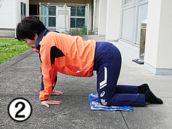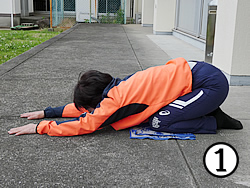 四つん這いになります。息を吐きながら写真@のように正座するような感じでお尻を引いて胸と脇が床につくように手を前へ伸ばし、10秒間静止します。息を吐き終わったら吸いながら元の姿勢へ戻します。このストレッチを2回行ってください。