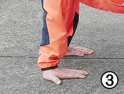 写真Aのように四つん這いになります。片腕ずつ写真Bのように指先を自分の方へ向けます。この姿勢のままゆっくり呼吸をして10秒間静止します。終わったら元の姿勢へ戻します。