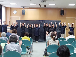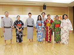 また、ゆかた帯結びの紹介と実演があり、半幅帯の飾り結び2種類の披露がありました。その後、7人の外国人参加者お待ちかねの「ゆかた体験」をしました。「振り袖は着たことがあるけど、浴衣は初めて」と喜ばれました。最後に「菊陽音頭」で盆踊り。外国人参加者には初めての盆踊りで、輪になって踊ること自体が珍しそうで、とても賑わいました。 |