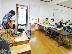 あさひヶ丘区にあるギャラリー「クロストークL&E」では7月25日(金)、5の日のティータイムで大津町在住の小西佳太さんを招き体験談とギター演奏が行われました。