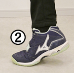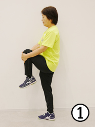 写真@のように片足で立ち、もう片方の足は膝を抱えます。呼吸は止めずに写真Aのように1、2、3とリズムよくかかとを持ち上げると同時に膝を自分の方へ引き寄せます。続けて片足10回行ってください。足を替えて同じ要領で行ってください。ふくらはぎのストレッチも同時に行います。