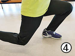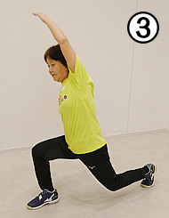 写真Bのように左足を前、右足を大きく後ろに引きます。息を吐きながら腰を落としてバランスをとり、左手をあげて体を左方向へ倒します。息を吐き終わったら吸いながら元の姿勢に戻します。このストレッチを3回行ってください。同じ要領で反対も行ってください。