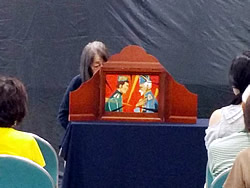 まず、絵本「へいわってどんなこと?」からスタート。絵本「まちんと」「チリンのすず」「へいわとせんそう」、紙芝居「のばら」、詩「まり」「雨ニモマケズ」と続きました。思いの詰まった演目に会場の皆さんは身を乗り出すように聞いておられました。途中、布絵本「くまもとのやさいくだもの」では各地の特産品を当てる楽しい声が広がりました。