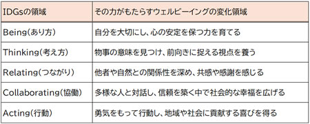 一方、IDGsが目指すのは、その“幸せ”を内側から育てる力を養うこと。つまり、SDGsが「社会をどう変えるか」を示す目標なら、IDGsは「私たち自身がどう変わるか」を導く目標です。