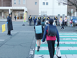 1月8日(木)は菊陽中学校、9日(金)には武蔵ヶ丘中学校校門前で登校してくる生徒たちに「おはようございます」と声をかけると生徒たちからも元気よく「おはようございます」と声をかけてくれました。 |