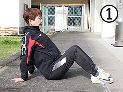 写真@のように座ります。息を吸いながら胸を張り5秒間静止します。息を吐きなが力を抜きます。このストレッチを3回行ってください。この時、支えている腕が曲がらないように注意してください。