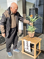 三里木区の森さん宅のアロエが30年育てて初めて花が咲きました。森さんは「嬉しいですね」と話されました。 |