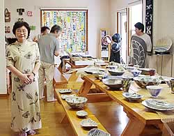 会場となった住宅は、太陽光発電を使い省エネルギーを考えた構造。オーナーの逸見芙美子さんは「催しものを通じて集い語り合う場として、たくさんの人に利用してもらいたいです」と話し、作家のアート作品やリサイクルの手作り品を展示即売しました。5日(土)には、陶芸作家の島田満子さんや染織作家の荒木伊保里さんも来場し、島田さんは「いい物を大事に使ってほしい。私のしわアートは水の浄化にも使われ環境も考えた作品です」と話し、荒木さんは、ペットボトルのラベルをつないだタペストリーなど「身近なテキスタイルを利用し、ものを大事にする生活を発信したい」と意欲を話してくれました。
