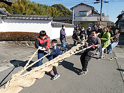 津留区(松岡区長)では1月12日(月)、昔ながらの伝承行事十五夜の綱引き、13日(火)、もぐらうちが行われました。