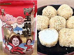 菓子はボール状で、表面には麦芽糖とピーナツで固めてあり、中は麩菓子のようなサクサクした生地です。当初はピーナッツと白ごまの2種類だったのが、今では10種類以上に増えており、一口サイズなので、店舗のある新北市の金山老街で食べ歩きや、お土産としても非常に人気があるそうです。(1袋120元)ホームページを見ると購入できるのは、新北市金山區にある2店舗のようですが、ほかの地域のスーパーや土産店などでも売られているのかもしれません。 |